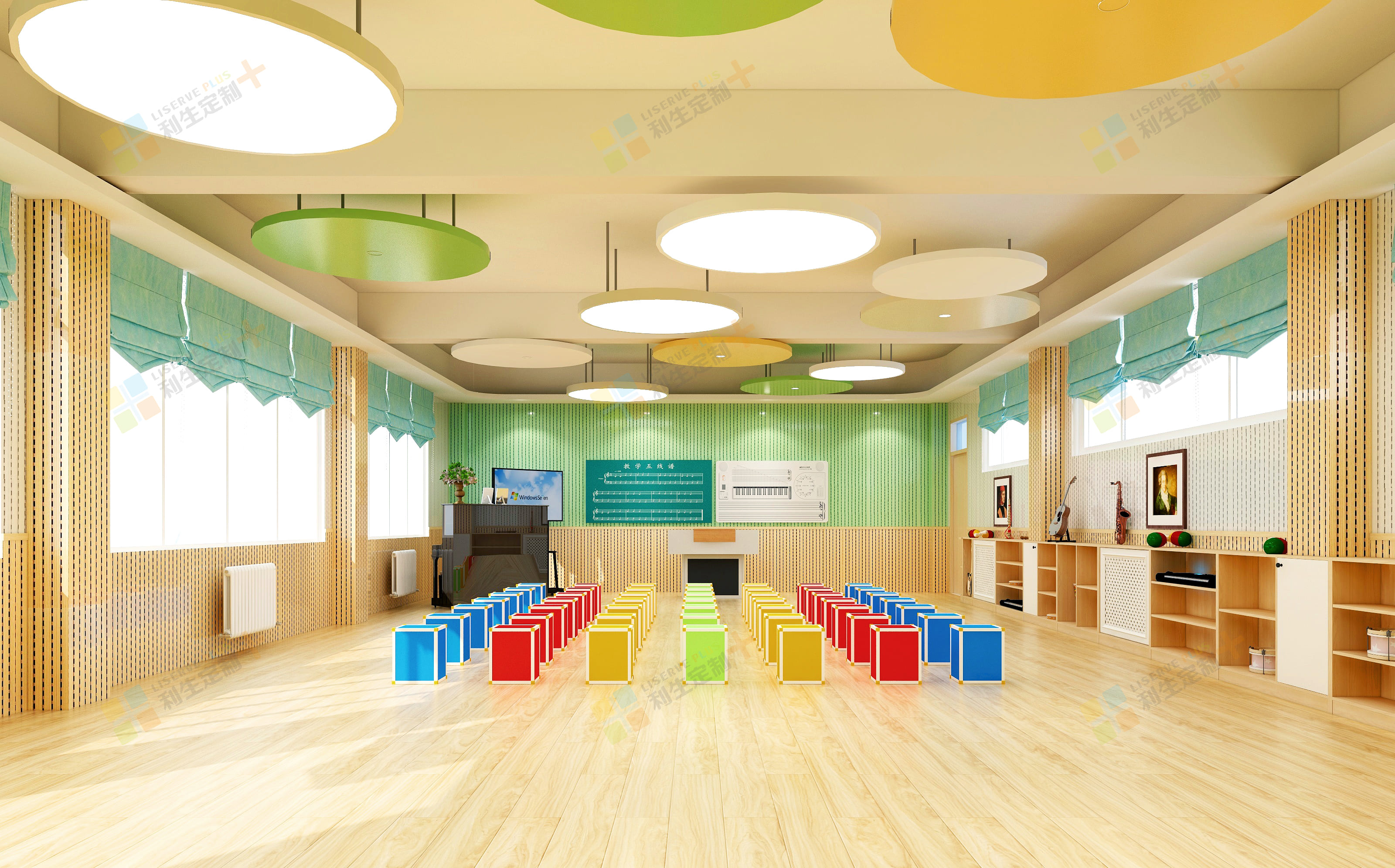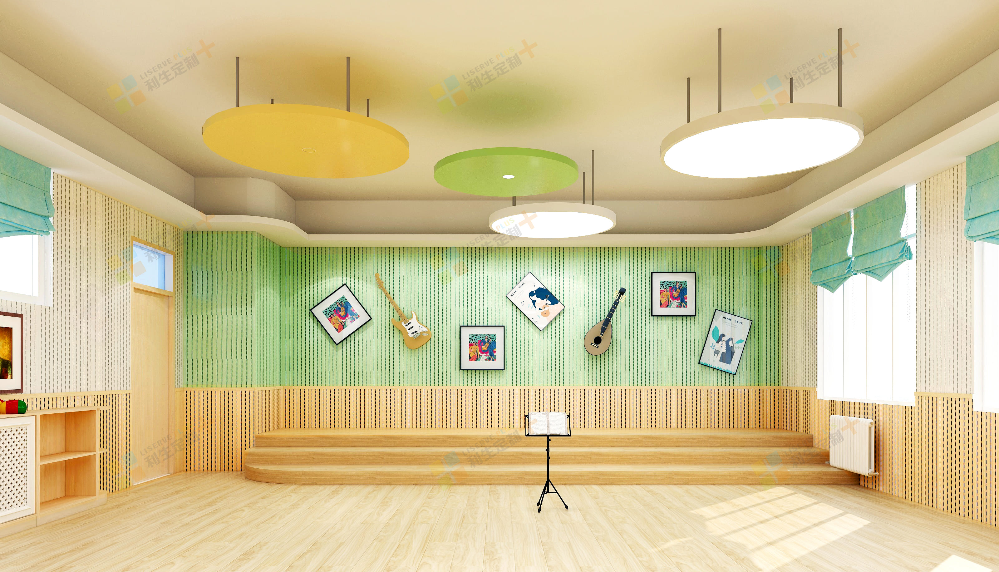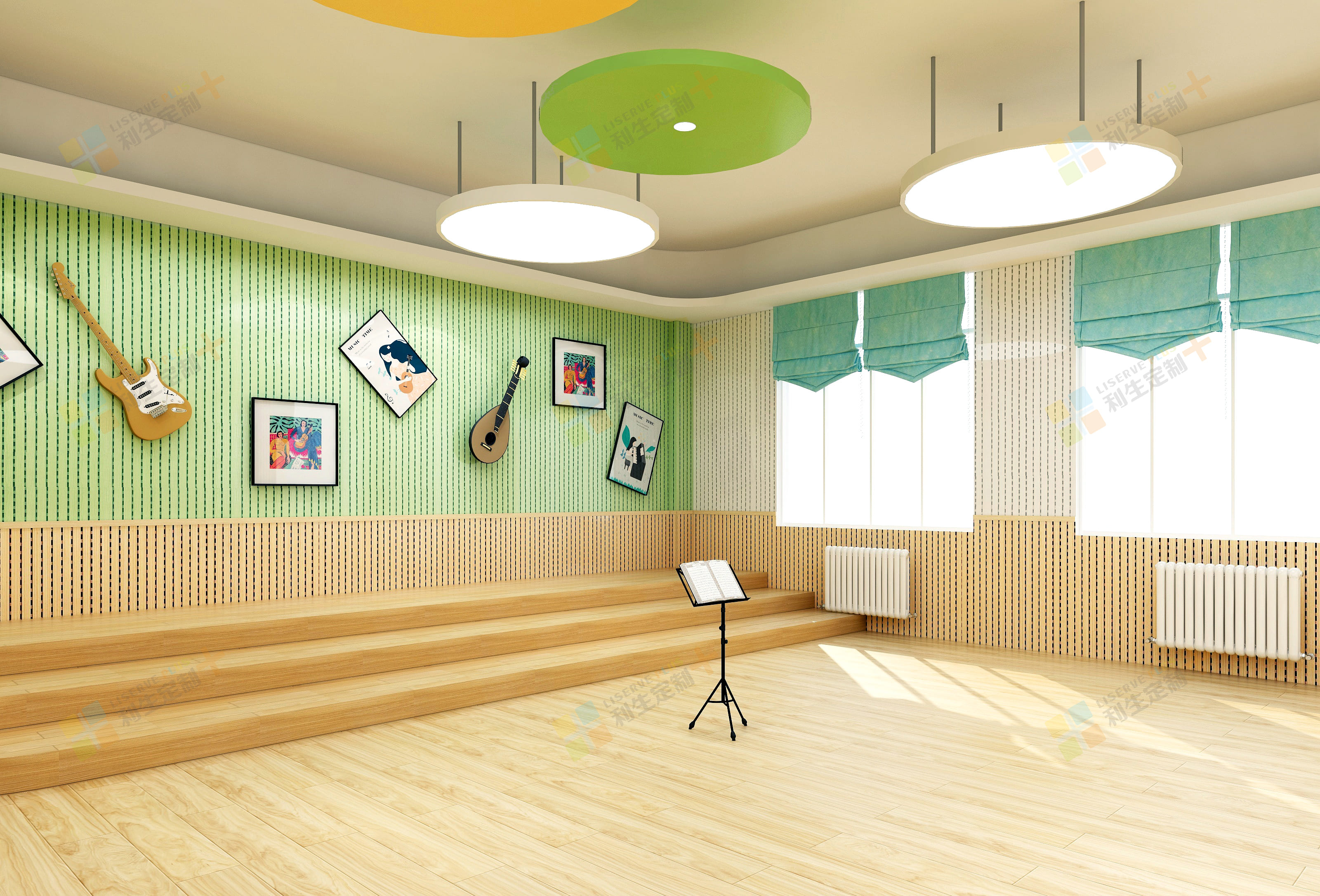 墙面音乐器材的摆设为教室增添更多艺术气息。