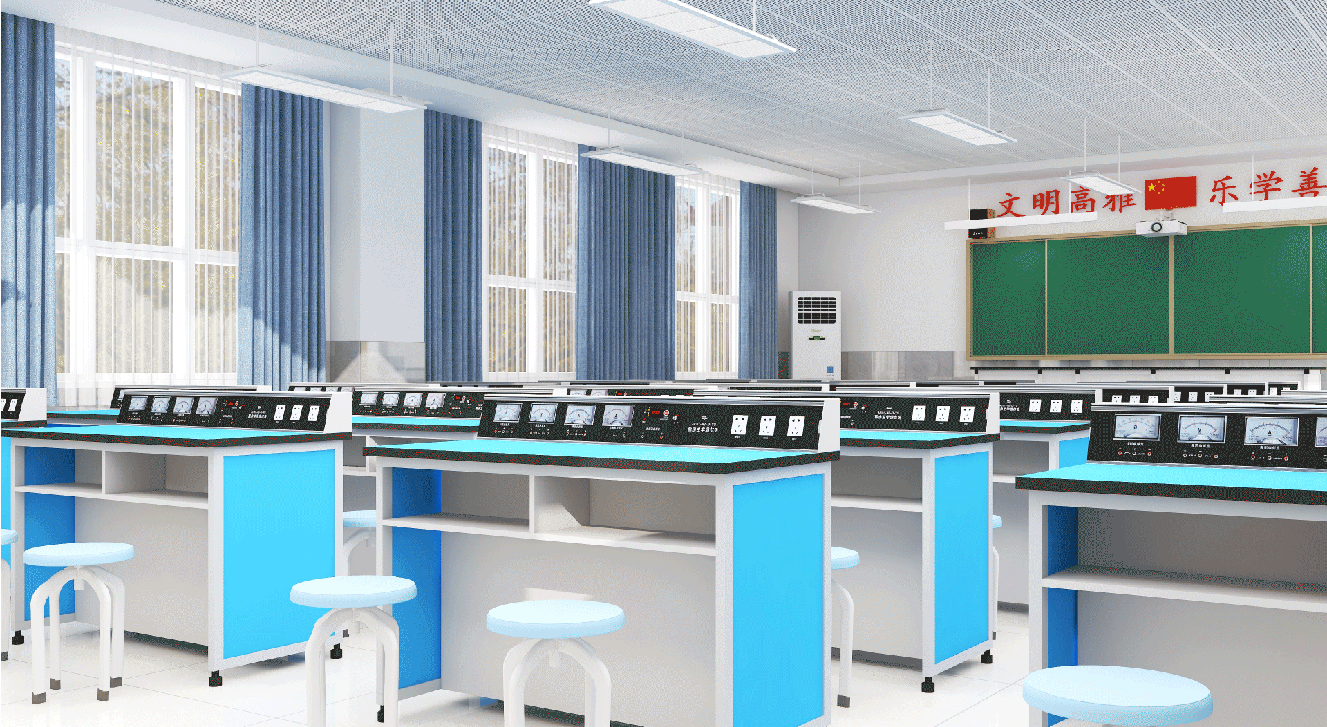 物理实验室(电学)所做的实验是初中和高中阶段物理课程中包含的相关实验,通常用于验证物理学科的定理和定律。是进行物理教学和研究的场所,包括物理实验仪器室、物理实验准备室和学生分组实验室。物理实验仪器室主要放置物理实验仪器。物理实验准备室设有实验台,台上配有各种实验仪器。室内要求光线充足,防尘,有通风设备,并有充分的活动余地。